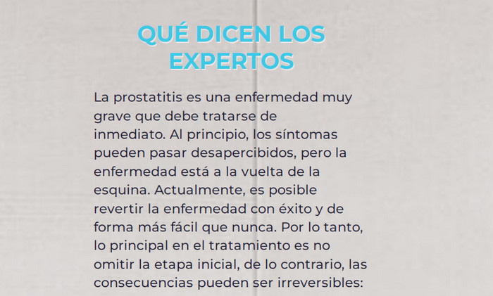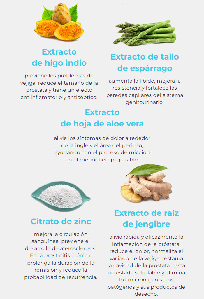 - Los extractos curativos que forman parte del producto contra la prostatitis, alivian la hinchazón y eliminan la inflamación en la glándula prostática, lo que elimina las principales causas de la prostatitis.