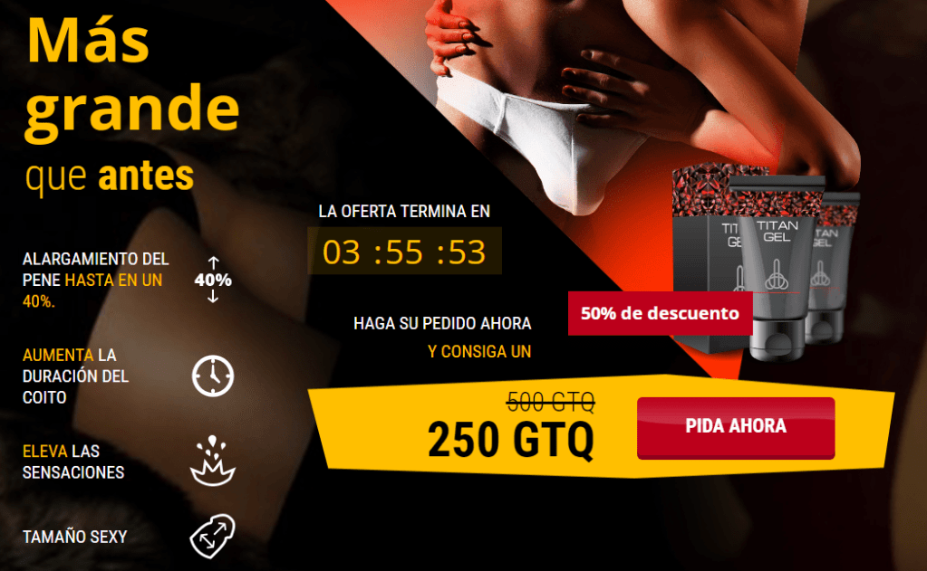 Todo hombre quiere sentirse como tal. ¿Pero qué pasa si te sientes como un renacuajo? Y lo que es más importante, ¿cómo puedes sentirte como un hombre si no tienes un gran renacuajo del que presumir? Pues amigo, ahora es posible gracias a un producto natural en forma de Titan Gel. Además del efecto principal – para aumentar el órgano, los componentes activos tienen un efecto restaurador, normalizar el equilibrio hormonal, aumentar el tono y la función protectora del cuerpo. Es un producto natural que mejora el rendimiento sexual masculino, igual que lo que toda dama desea. ¡Siéntete como un verdadero hombre con la ayuda del gel Titan!